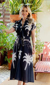 Chic black midi dress adorned with playful palm motifs, a true epitome of summer elegance. Crafted from a lightweight and breathable linen-like fabric, this dress promises utmost comfort even under the sun's embrace. Its versatile design exudes sophistication, making it an essential piece for summer getaways, trips, and cruise vacations.