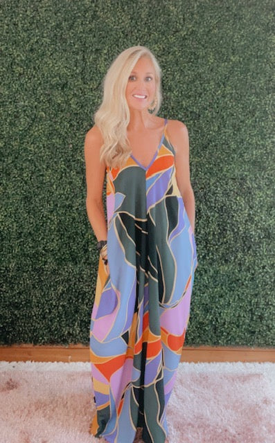 Multi Color Block V-Neck Maxi Dress with Pockets