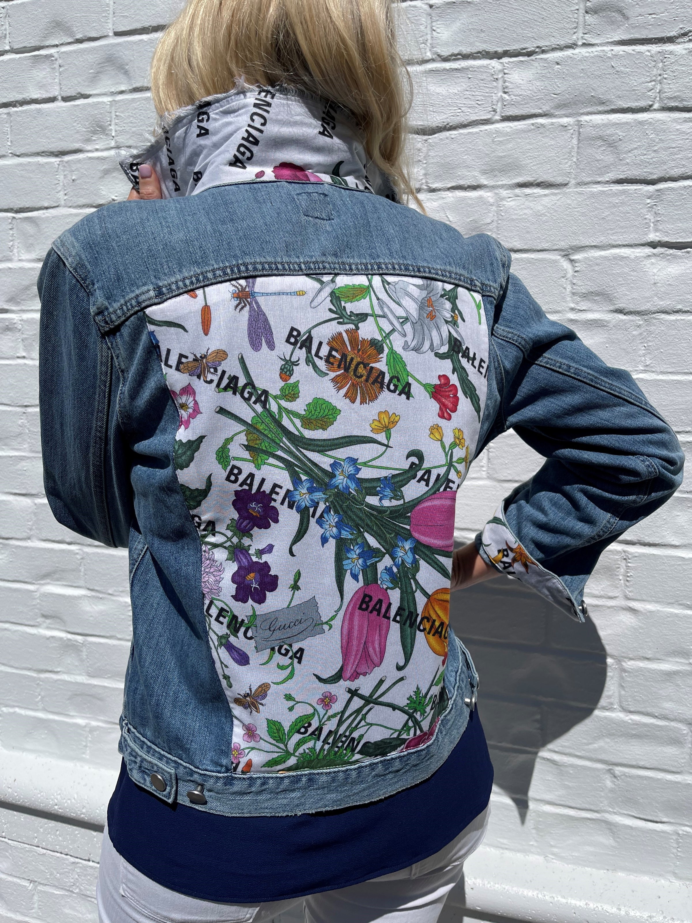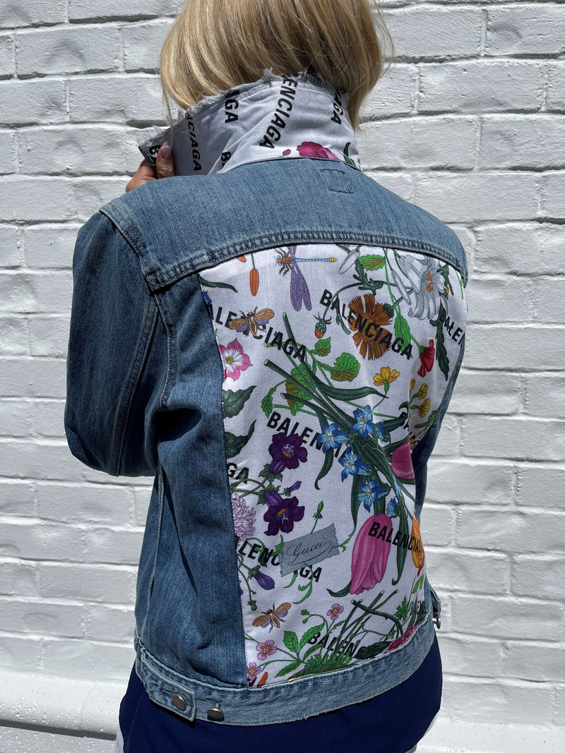 Handcrafted Denim Jacket with Authentic Limited Edition GG scarf on Back, Cuffs, and Collar.