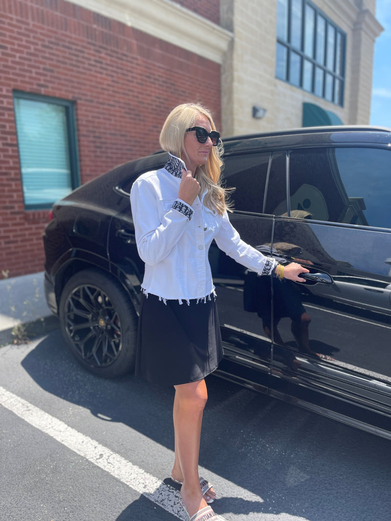 Handcrafted White Denim Fringe Jacket with Authentic CD scarf on Back, Cuffs, and Collar.