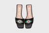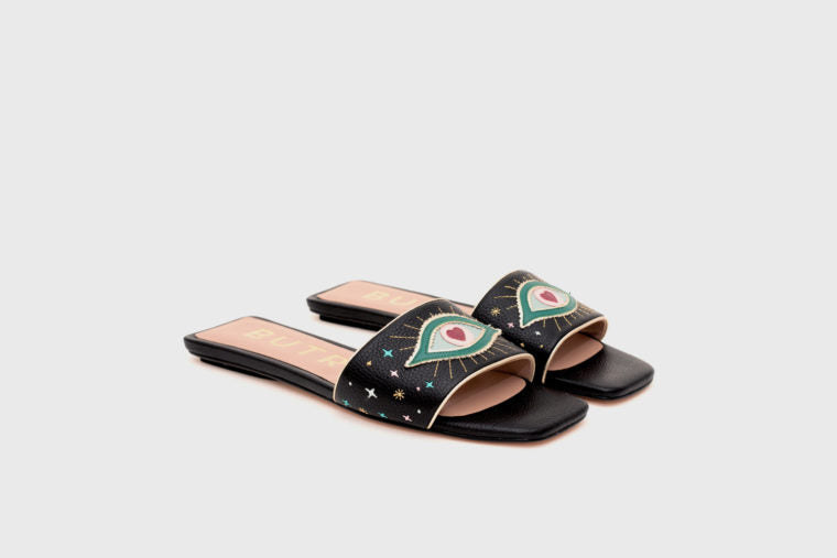 The Butrich Shazam Slide, Black Leather flats, with Eye Embroidery are so gorgeous and fun!